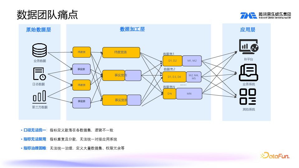 这样的模式下需要制作很多数据集,一个数据场景就要注册一个数据集,并且权限分配在数据集层面,比如同一指标在不同数据集会定义不同权限,因此存在大量冗余。二是指标逻辑不一致,难以复用。这些是数字团队面对的主要痛点。