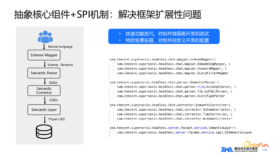 这样,数据团队可以更加专注于开发数据工具。同时,数据解读问题也得到了解决,业务方不再需要导出数据自行解读,现在 Planner Agent 会对数据进行总结再返回给业务端。7. 抽象核心组件+SPI 机制:解决框架扩展性问题