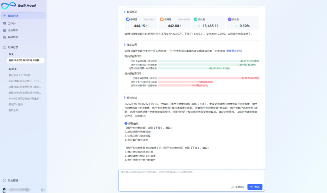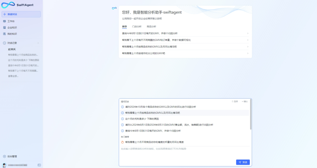 同时,具备强化学习能力,能根据用户的“点赞”和“踩”反馈不断纠正错误、调整查询,更加精准地满足用户需求。此外,SwiftAgent还将用户过往的问答分析进行沉淀并强化学习结果,在相似问询场景中直接提供结论及思考过程,展现出强大的思考及学习能力。其双向交互功能更是将AI思考过程白盒化,让用户清晰可见,进一步增强了用户体验。数势科技SwiftAgent让数据查询和分析变得像说话一样简单,无需技术背景也能0门槛取数。数势科技SwiftAgent智能分析助手,为企业高管带来了即问即答并且提供归因分析与策略建议的数据分析体验。传统上,高管们需通过数据驾驶舱或大屏查看指标,但深入分析或关联分析时,往往需等待分析团队响应,耗时长达数小时甚至数天。而今,借助SwiftAgent,无论是在PC端还是手机端,高管们都能随时进行自然语言查询、高阶归因分析及异常分析,无需等待秒级获取企业核心经营数据。SwiftAgent不仅以图表形式直观展示业务结果,如柱状图、折线图、环状图等,还辅以文字解释,让业务现状、对比、趋势一目了然,助力精准决策。