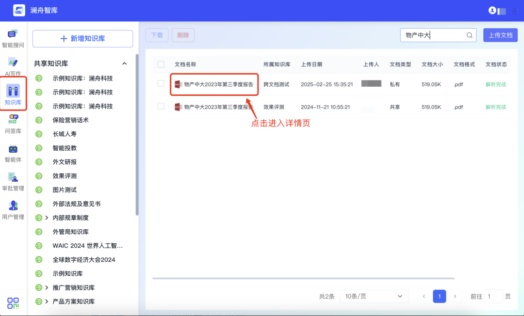 在企业和个人的数据分析及决策过程中,表格数据无疑是极为重要的资源。然而,面对复杂多变的表格结构和海量的数据信息,如何快速准确地提取和理解所需内容,一直是企业和个人面临的难题。澜舟智库的表格智能问答功能,为解决这一问题提供了很好的解决方案。仅需输入问题,系统就会迅速解析表格结构并通过精准的推理计算,快速呈现出你想要的答案。方法1:打开澜舟智库首页,点击左侧知识库,点击相应文档进入详情页,即可发起提问。