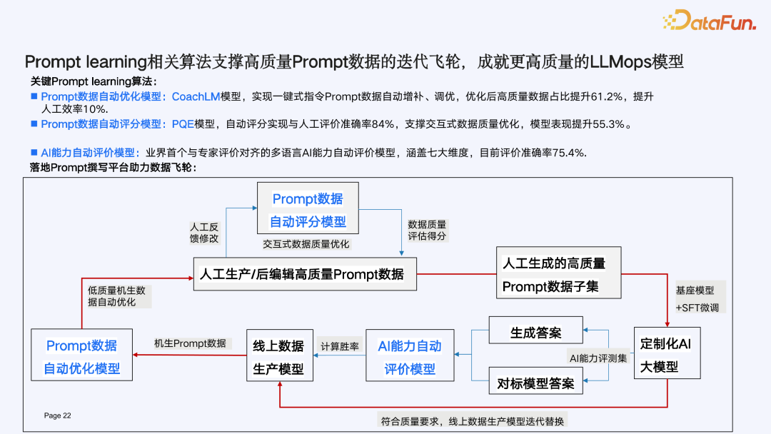 以下是我们部署的 Prompt Learning 数据飞轮的过程:①使用开源数据集如 Alpaca,并对其进行泛化,生成合成数据,然后优化质量(机器生成的数据质量可能不高);②进行质量评测,包括人工编辑,得到高质量的子集;③对这些数据进行模型评价,再让模型生产新数据。