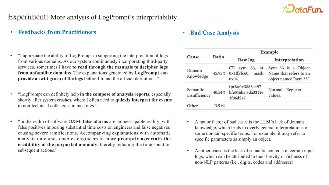 另一个关键点是误报处理。系统报告异常时,不知道是否需要处理,如果 LogPrompt 能提供简短解释,可能有助于处理误报。我们也做了一些坏案例(Bad