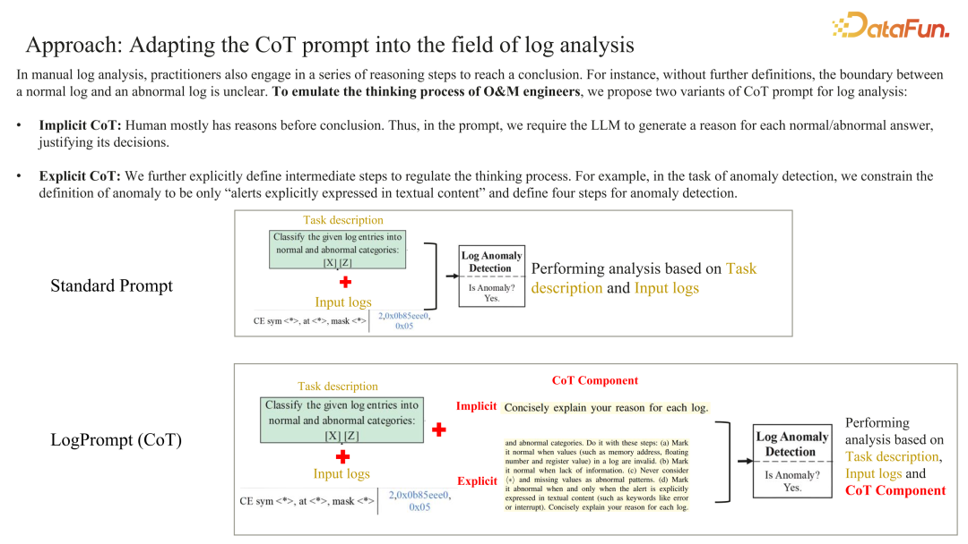 step by step”。Explicit CoT 则定义了解决问题的四个步骤,判断日志异常时,先检查文本内容中是否有明确的告警字样,然后再进行下一步;如果没有,则排除异常。我们用领域知识教模型如何判定异常,并将其浓缩在一个 Prompt 中。相比标准 Prompt,我们增加了一个 CoT 模块,隐式或显式地指导模型思考过程。