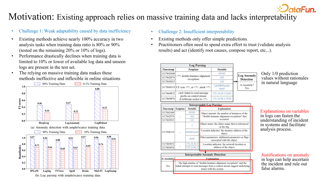 传统日志分析的两大痛点是依赖大量训练数据和缺乏可解释性。我们做了一些小实验,发现传统方法在训练数据占整个数据集 70-80% 时表现很好,但当训练数据减少到 10% 时,效果显著下降。这就是由于在线场景中大部分日志是新的,模型缺乏适配的训练数据,导致性能下滑。频繁重新训练模型成本高,因此需要新的解决方案。