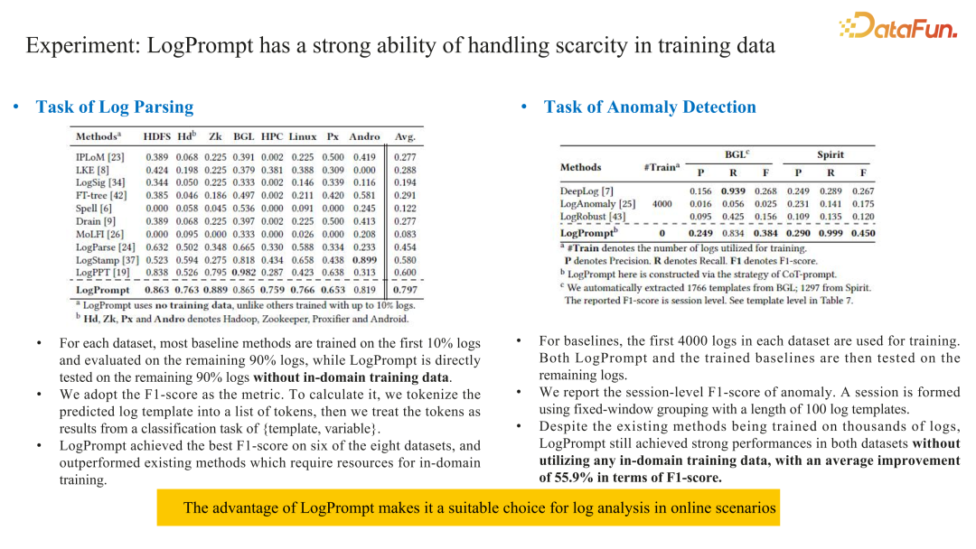 第一个实验显示,LogPrompt 在零样本日志分析场景中表现良好,减少了对训练数据的依赖。我们首先看左边,日志解析中的零样本场景是指算法没有任何训练输入,每个日志都是新的,没有历史日志。相比之下,传统算法需要训练数据。我们使用10% 的数据进行训练,模拟在线场景,因为以前的研究也有类似的做法。实验表明,在八个领域中,LogPrompt 在六个领域取得了最佳效果,平均来看也是最佳。