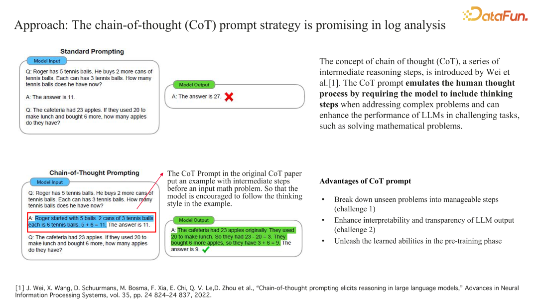 我们一开始引入了 CoT 策略。CoT 的核心思想是模拟人的思考过程,不是直接输出答案,而是要求模型逐步思考(如“think step by step”),这对解决我们的两个主要问题很有帮助。①CoT 将未知问题分解为可处理的小步骤,解决了大量未见过的新日志的处理难题。②CoT 使模型输出更多的逻辑过程,不仅仅是一个答案,这为生成解释性报告提供了新的思路。通过 CoT prompt,模型的输出内容更加丰富,报告更加完整,逻辑也更清晰,同时释放了其预训练阶段的潜力。