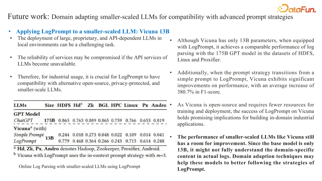 我们进行了初步实验,使用了 Vicuna 13B 小模型,它可以直接部署。我们使用 Simple Prompt 和 LogPrompt 对日志异常和日常日志解析任务进行测试。尽管 Vicuna 只有 13B 的参数,但在 HDFS、Linux 和 ProxFire 等领域的表现已接近于 ChatGPT。我们认为,小模型有潜力完成这些任务,并且高级 LogPrompt 策略在小模型上也有效。然而,在许多领域的表现仍不理想,提升有限,离实际应用还有距离。Vicuna 等小模型缺乏日志或运维相关语料的训练,知识容量也较小,因此我们可能会对其进行知识注入和领域适应,来提升其性能。