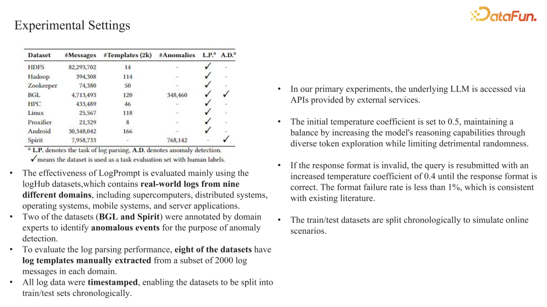 我们进行了一系列实验,实验设置来自于 LogHub 数据集,其中包含了各种真实收集的日志数据,包括来自 HDFS、Hadoop、Zookeeper 的,软件、操作系统以及手机的日志。其中,BGL 和 Spirit 数据集都有专家标注的异常标签,其余数据集则有人工打的模板。在我们的主实验中,使用了 ChatGPT 的 API,这个实验是去年进行的,包括 temperature 等各项参数都进行了设置。对于训练集和测试集的划分,选择按照时间顺序进行划分,即选取时间上出现的前 10% 的数据作为训练集。