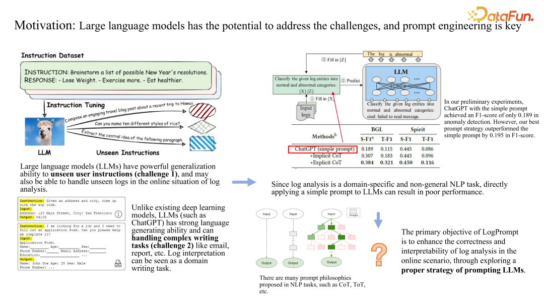 另一个问题是现有方法缺乏可解释性。传统方法将日志处理成 1/0,输出也是 1/0,用户只能看到一个概率值。如今用户希望看到详细的解释,如为什么认为日志异常,或者生成简短报告来减轻运维工程师的负担。我们希望通过大模型和 Prompt 策略来解决这两个问题。