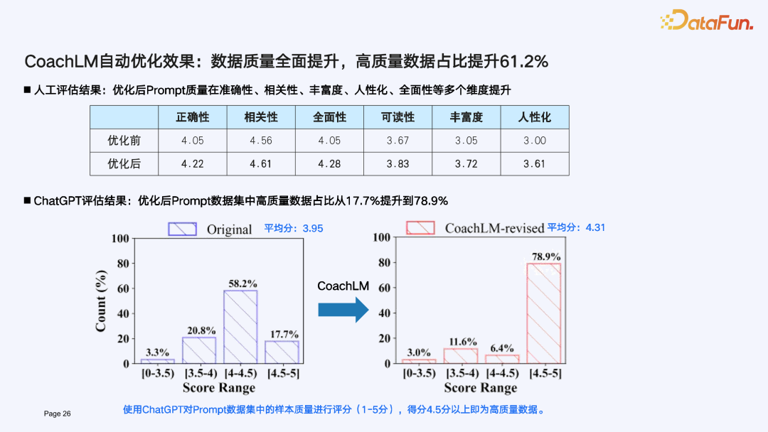 我们进行了一些实验,看到了数据质量的全面提升。左侧是原始的 Alpaca 数据集,右侧是我们优化过的 5 万条数据,使用 ChatGPT 对这些数据进行评分,结果显示优化后的数据质量普遍较高,得分 4.5 以上的数据占比从 17% 增长到了 78%。此外,我们还从六个维度对数据进行了人工评分,对其进行了全面的评估。