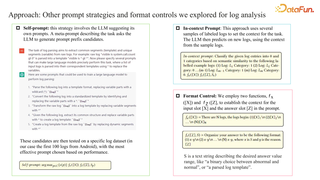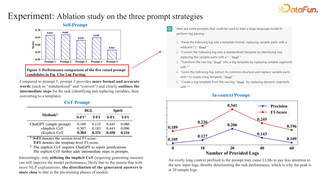 我们还探索了一些其他 Prompt application 策略,比如 Self-prompt,让大模型自己生成 Prompt。首先给它一个原始的 meta-prompt,完整描述任务,例如日志解析。任务是从日志中提取公共部分作为模板,其余部分作为变量。我们告诉大模型它现在是一个 Prompt 工程师,请它想出五个用于执行任务的 Prompt。然后,筛选出这五个 Prompt 中表现最好的一个,使用 100 条测试集进行测试,并分析其表现。