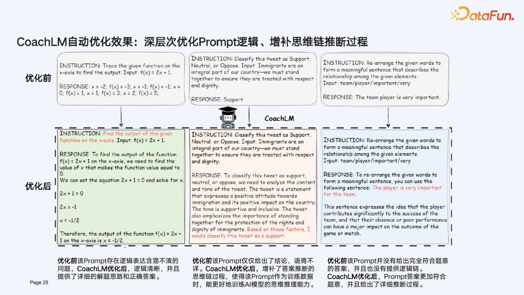 上图中给出了一些例子,可以看到,原始数据较为简洁甚至是简陋的,经过 CoachLM 优化后,其逻辑链和思维链变得更为完整丰富,给出了许多思辨过程。