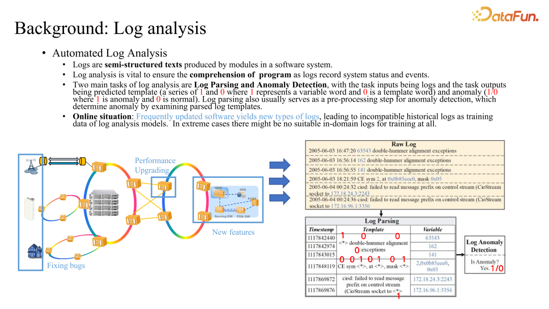 软件系统产生的半结构化文本,传统上需要运维工程师手动分析,但随着自动日志分析算法的出现,出现了很多细分任务,其中两个经典任务是日志解析和日志异常检测。日志解析涉及从原始日志中提取模板和变量,模板是日志词,变量是 IP 地址或序号等,传统方法将其转化为 1/0 组合。而日志异常检测则是输入日志,输出 1 或 0 表示是否异常。
