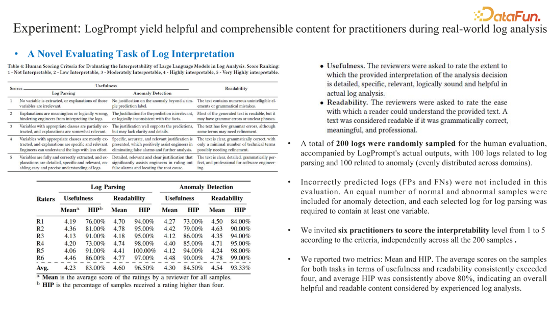 Interpretation。从之前提到的八个领域中随机筛选了 200 条日志,并请六位业界 AIOps 专家进行人工评测。输入为原始日志,输出要求 LogPrompt 进行解释,例如异常检测需说明原因,日志解析需解释日志内容。