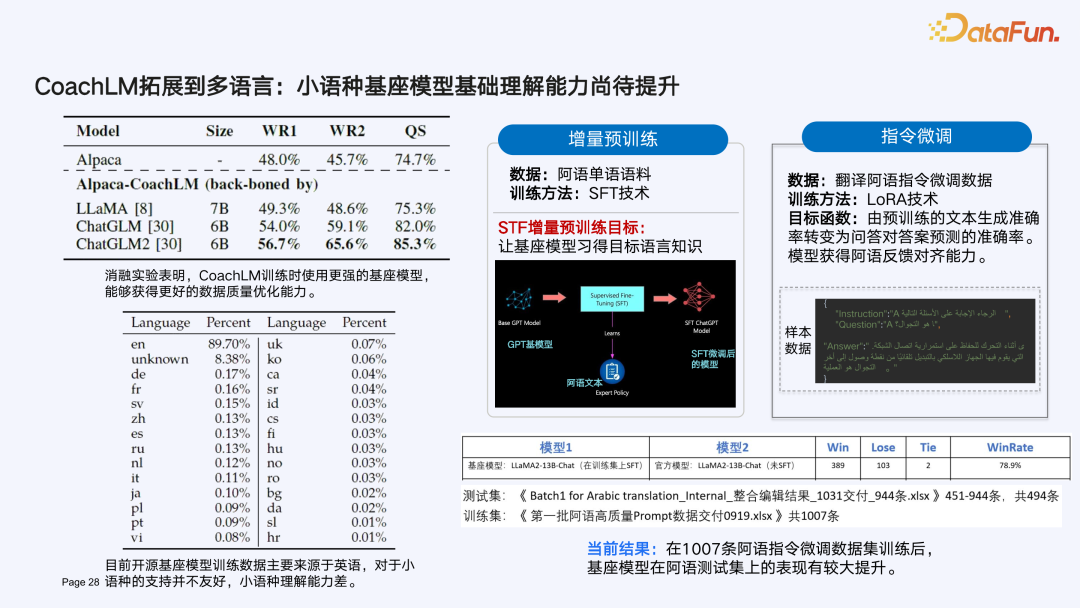 接下来,我们计划将工作扩展到多语言方向。目前大量开源模型主要用英语训练,对多语言支持不佳。我们的实验表明,Coach 的优化效果与基座关系密切,如果基座效果不好,Coach 的效果也会不好。因此,我们未来的方向是通过增量预训练或多语言指令微调,增强模型的多语言能力。