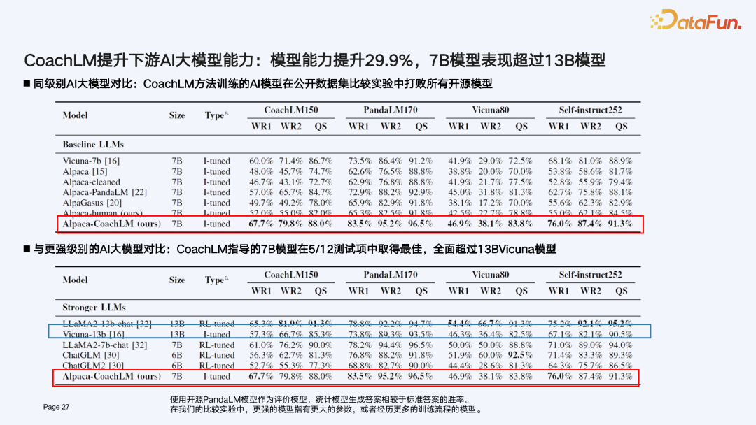我们用这批数据训练了一个模型,并在开源的 benchmark 上进行了测试。结果显示,我们的 7B 模型取得了最佳成绩,超越了所有开源模型。我们还与更强的模型进行了对比,结果发现我们全面超过了 Vicuna-13B 模型,并在五项测试中取得了最佳成绩。