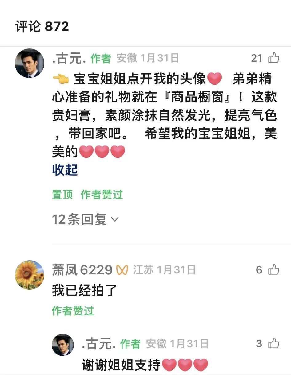 例如上图中的视频号“·古元·”,瞄准的就是渴望关怀的高龄女性。视频大多以“我的宝贝姐姐开头”,发布的视频大多围绕老年女性的生活常态展开,“我发觉姐姐近来面容憔悴,弟弟跑了好多地方,找到这款面霜特别适合姐姐”,随后引导用户点击主页关注、下单。