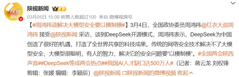 全国政协委员、360集团创始人周鸿祎认为,传统网络安全的解题方法解决不了人工智能的安全问题。智能体的安全、知识数据的安全、客户端的安全、基座模型的安全,构成人工智能安全的新领域。他建议,应由既懂安全又懂AI的企业牵头,以模制模,通过打造安全大模型来解决大模型的应用安全问题。