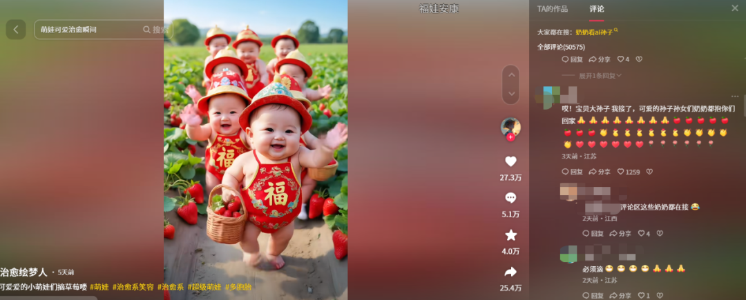 图源:抖音截图然而,中老年人几乎没有识别AI创作的能力。陆俊不止一次提醒奶奶这是“假的”,是AI生成的,有些视频下方会有AI创作的提示,但奶奶都不以为意。陆俊对此也十分无奈,“我第一次提醒奶奶的时候,她有点震惊,但之后还是继续看,她并不在乎小孩是真的还是假的,只觉得能让自己开心的就是好东西。”