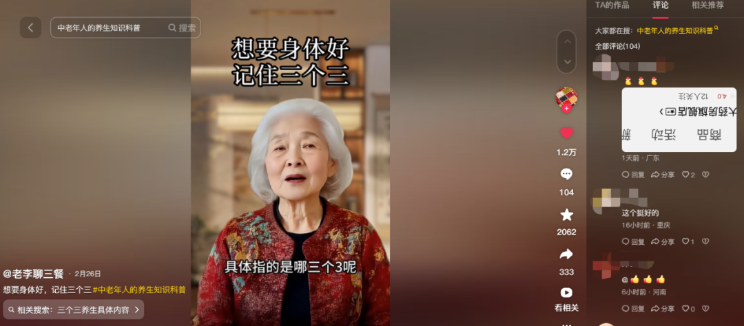 图源:抖音截图如果单纯只是把这当作消遣也无妨,令人担心的是,这些AI形象说的话,家里老人全都信。刘然(化名)的外公经常往家族群里转发一些养生专家的科普,有次刘然点开看才发现,外公嘴里的专家其实是AI创作的数字人。
