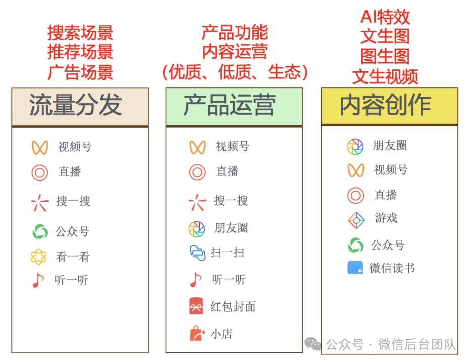 微信存在大量AI计算的应用场景,主要分为三种:流量分发、产品运营和内容创作。流量分发场景中的 AI 计算主要用于搜索、广告、推荐场景的核心特征生产,产品运营相关的 AI 计算主要用于产品功能相关和内容运营相关(低质、优质、生态建设),由于大模型的兴起,AIGC 相关的文生图、图生图、AI 特效等内容创作场景的 AI 计算也有了较多的落地。目前AI 计算几乎覆盖了微信的所有业务场景。