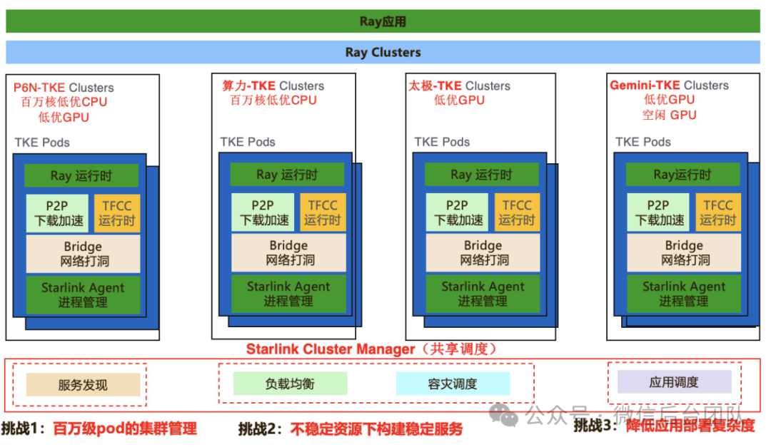 我们在落地 Ray 的过程中遇到了三个核心技术挑战:1. 百万级 pod 的集群管理:在视频号业务场景中,有超过百万核的超级应用,已经远超 K8s 集群上限,我们希望单个 Ray 应用能支持百万级别的 pod 的扩展。2. 不稳定资源下构建稳定服务:由于 AI 计算的资源消耗大,为了降低成本,我们大量使用了低成本、闲置,但稳定性差的计算资源。我们希望可以在不稳定资源上提供可靠稳定的服务。3. 降低应用部署的复杂度:微信内 AI 应用遇到模型、硬件、模块三种维度的异构问题,部署复杂度高。我们希望使用统一的应用维度来简化应用部署,即将 O(n^3) 复杂度降低为 O(1)。Astra 的部署系统架构如上图,在 Poseidon/算力/太极/Gemini 等多个资源平台基础上扩展多个tke模块,组成拥有数百万核CPU、万卡GPU级别的超大集群。我们通过服务发现的架构设计,解决了百万级pod集群管理的问题,通过负载均衡和容灾调度解决了不稳定资源构建稳定服务的挑战,同时通过应用调度解决了多模型应用部署复杂度的问题。接下来详细介绍我们如何应对这三个技术挑战。