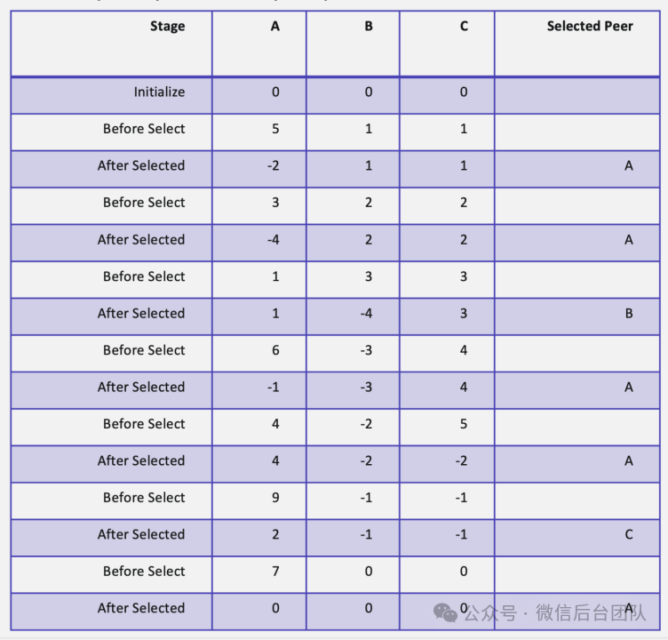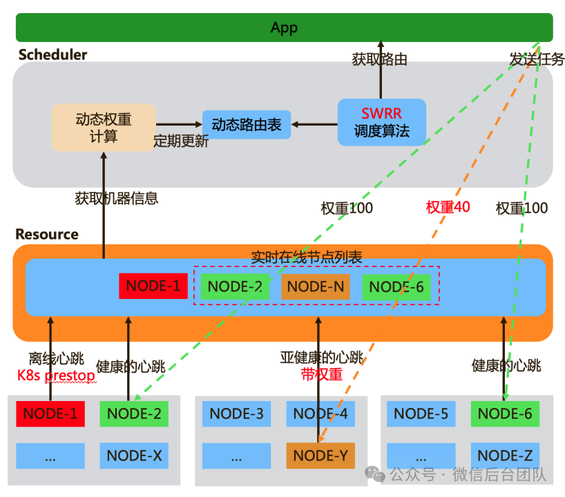 AI 应用往往具有计算量大,单机 QPS 低的特点。在这种服务场景下,微信后台常用的一致性哈希已经无法将请求均匀的分发了。除此之外,低优和免费资源因为经常被在线任务抢占,节点间性能往往参差不齐。我们选用 SWRR [6](Smooth Weighted Round-Robin)算法作为基座,并进行优化,首次应用到低 QPS 的任务调度系统中,实现请求分布的快速调整。算法步骤如下:对于每个节点:节点权重=节点核数或卡数∗log(剩余利用率)∗(当前利用率/节点当前并发)这个公式构建了一个模型,简单的描述了请求量预期的分布,节点权重描述的是当前节点处理新增任务的能力,处理能力越高的节点应该分配到更多的请求。其中1) 节点核数或卡数是代表节点的资源总数,资源总数与处理能力成正比,对于不同的GPU,资源总数即不同卡的性能对比系数。2) log(剩余利用率)是节点当前剩余资源,剩余资源量与处理能力成正比。其中,log是一个经验值,在log后,算法在高负载时表现较好。3) (当前利用率/节点当前并发)本质上是机器性能的体现,假设大盘下每个任务同一时刻的消耗是接近的时,这个公式成立。这里是SWRR的标准流程,因为SWRR算法的复杂度是O(n),我们的实现会对性能做一定的优化,比如分block,多算法实例等。1) 对于每个节点:节点路由权重 = 节点路由权重 + 节点权重算法流程样例,假设{A,B,C}节点权重为{5,1,1}