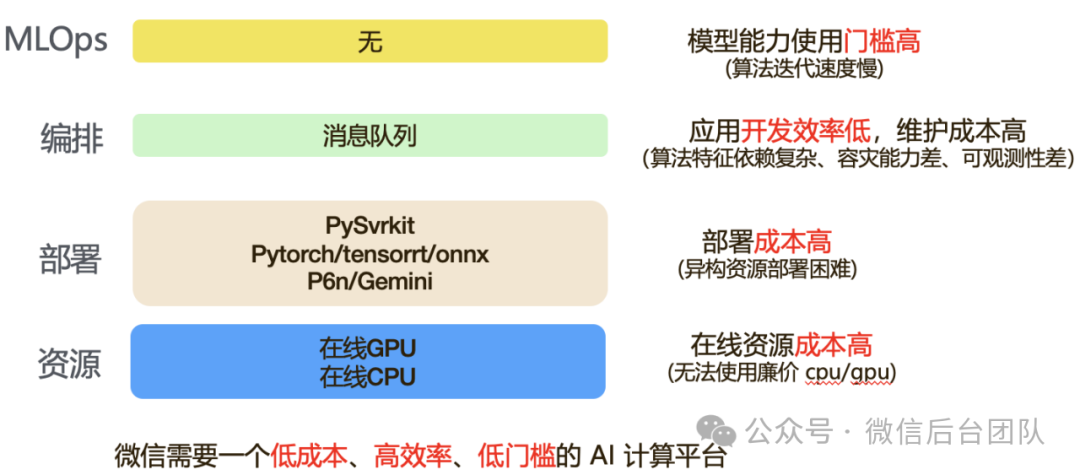 然而,我们在使用微信已有的后台基础设施实现AI应用时遇到各种问题。在资源层面,AI应用属于计算密集型,计算复杂度高,需要大量资源,直接使用在线资源会导致成本过高;在部署层面,微信后台常见的部署平台更适合部署I/O密集、高并发、高请求量的微服务,而AI应用则需要适配大量异构硬件和异构资源平台,部署复杂度呈指数级上升;在应用编排层面,直接通过消息队列等基础组件解决复杂特征依赖及相关异步过程,开发效率低,变更风险高,可观测性差;在平台层面,由于缺乏平台支撑,算法迭代速度慢,模型能力使用门槛高。因此,微信亟需一个低成本、高效率、低门槛的AI计算平台来解决上述问题。