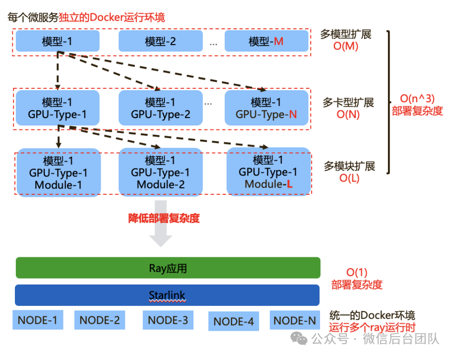 AI 应用的部署涉及三个方面:多模型扩展、多卡型扩展、多模块扩展(单模块超过 K8s 部署上限),一个超级应用的部署复杂度为 O(n^3)。AstraRay 的创新方案使得一个应用可实现三个维度的扩展,将复杂度降低为O(1),极大提升了 AI 应用部署的效率。多模型扩展问题的本质是模型运行环境的动态切换,这里包含两个问题: