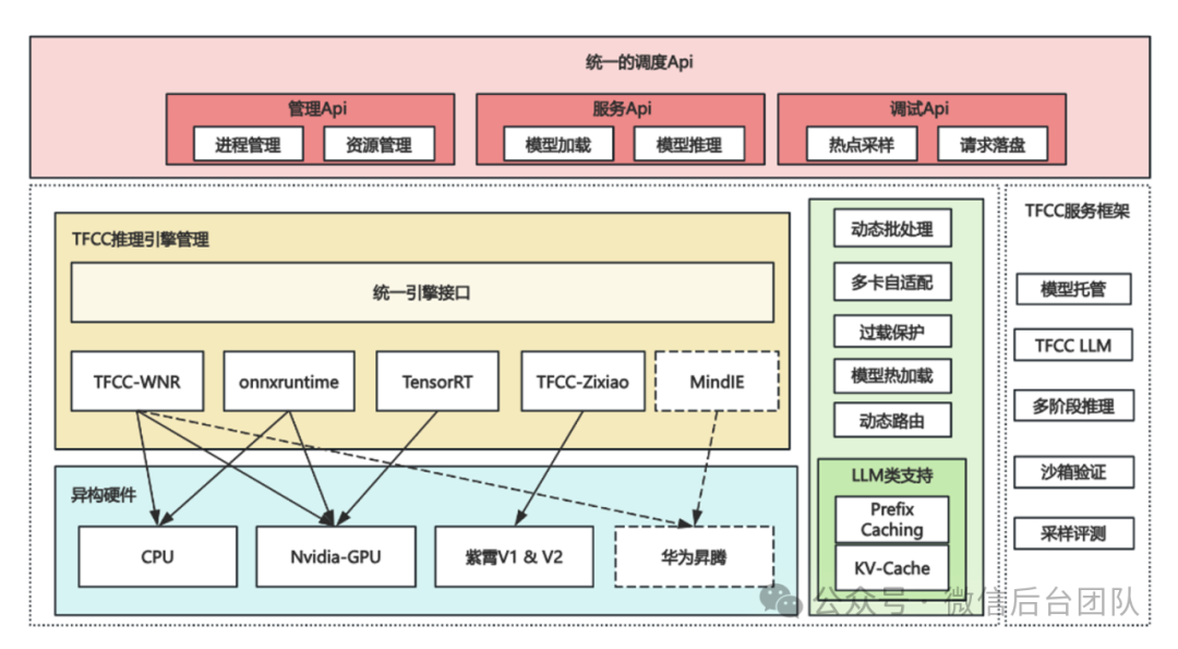 1. 不同的推理业务形态多样:引擎种类多模型类型多(pytorch/onnx/tensorrt...)2. 异构卡型的适配工作繁琐且重复度高(英伟达/紫霄/华为)我们基于TFCC框架提供标准服务框架,统一了接入模式,透明化了引擎实现,算法仅需声明模型,不再需要手写推理代码,同时内化异构卡型适配工作,屏蔽硬件细节,在应用层实现一份代码、多处推理,支持灵活多样的AI应用场景。