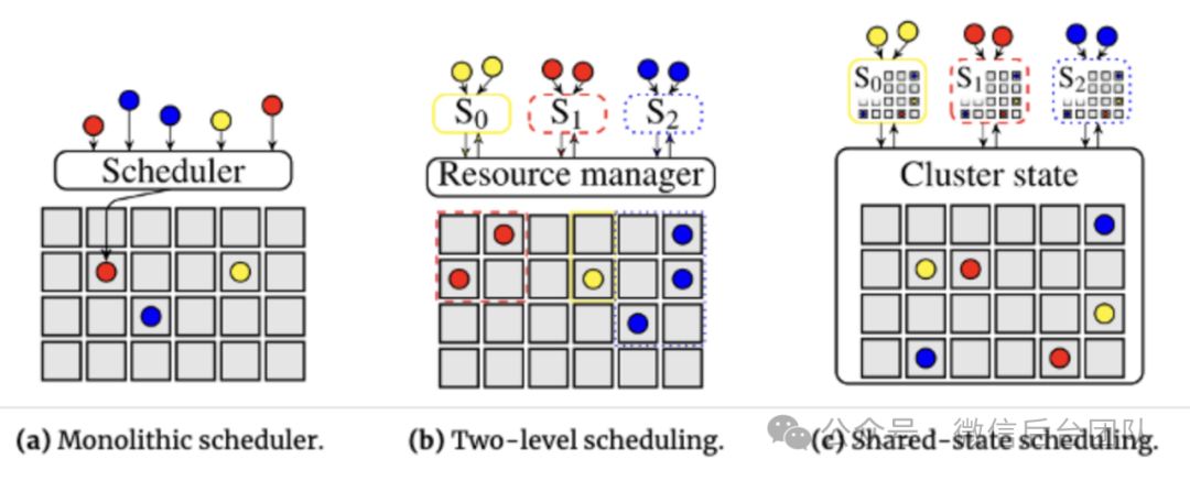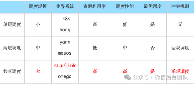 业界系统的调度架构主要分为四类:单体调度、两层调度、共享调度和混合调度。这些调度架构的本质区别其实只有两点:单体调度顾名思义,即只有一个调度器,调度器拥有全局资源视图的架构,Google Borg 和 K8s 都采用这个架构。单体架构的好处是,所有的任务都由唯一的调度器处理,调度器可以充分的考虑全局的资源使用情况,能方便的做出最优调度。但由于调度架构的限制,集群性能受限于单体的性能,无法支撑过大的集群。两层调度拥有多个调度器,Apache Mesos 和 Hadoop YARN 都采用这个架构。两层调度中,每个应用的调度器首先向中心节点获取资源,再将其分配给应用中的各个任务。两层调度解决了单体调度的性能问题,但是调度器仅拥有局部资源视图,无法做出最优调度。共享调度拥有多个调度器,每个调度器拥有全局资源视图,Omega 采用了这个架构。共享调度方案中,每个调度器都可以并发地从整个资源池中申请资源,解决了性能问题和最优调度问题,且可以支持较大集群。因此,AstraRay 选择共享调度来支持超大规模的资源管理。调度器间资源申请冲突可通过悲观锁或乐观锁来解决,AstraRay 实现了基于乐观锁的方案,出现冲突后再处理,无需中心节点,并发度更高。我们提出了一个新的调度系统 Starlink 来更好适配异构资源和硬件。Starlink采用共享调度架构,通过乐观并发调度处理冲突,支持部署在任何基础资源平台(K8s/Yard/CVM)之上,且允许单个应用运行于多种异构的资源节点上。
