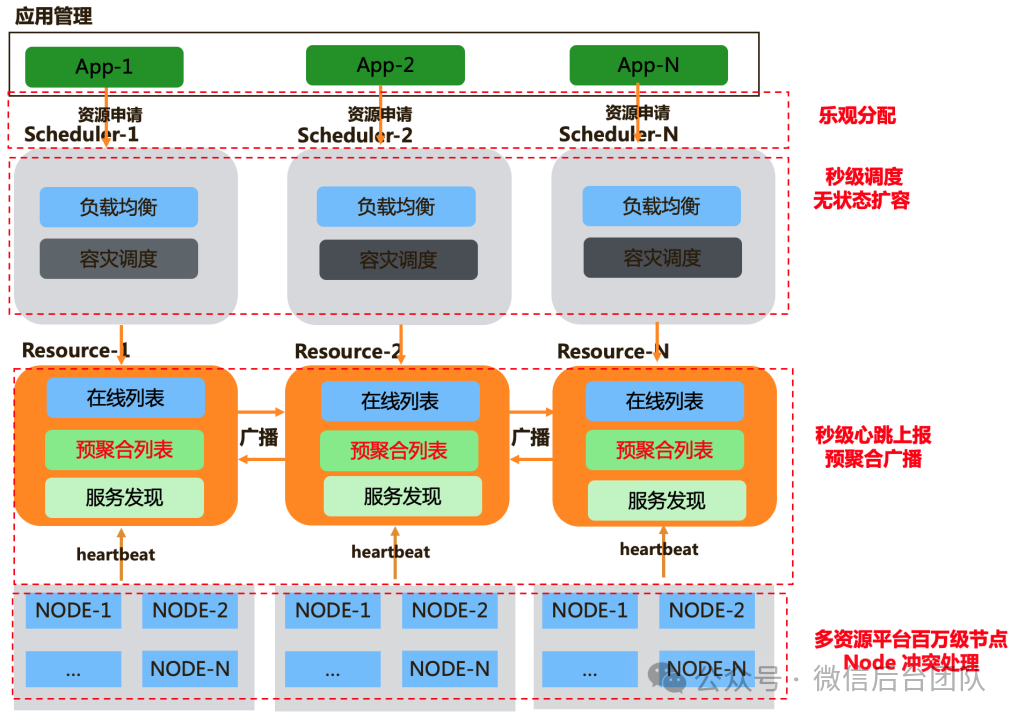 Node:任意部署了 Starlink 的 Agent 节点都可以成为 Node,Node 每秒会向Resource 上报自己的状态,并处理APP部署的任务。Resource:Resource 从 Node 接收心跳,并预聚合心跳后广播到其他 Resource 节点。Resource 整合所有 Node 组成在线列表,可像无状态服务一样水平扩容。为提供业务间隔离性和降低广播的扇出比,Resource集群数也会扩展。App:App 是运行在 Starlink 上的应用,每个 App 都拥有独立的资源调度器,这些调度器都从 Resource 获取全局的资源视图,通过乐观并发抢占的方式分配资源。Scheduler:Scheduler 负责应用的负载均衡和容灾,Scheduler 会根据不同的节点的性能和状态动态的调整节点的权重,并通过带权路由算法来分配请求。在微信的后台服务中,每个微服务都是独立的模块。而面对超大规模的应用,由于 K8s 自身扩缩容性能的限制,往往需要部署多个模块才能满足一个AI应用,扩缩容速度受限。与K8s 不同的是,Starlink 使用预创建的 Pod,加快了扩缩容的速度,资源迁移变得非常简单。基于良好的设计,Starlink可以支持单应用百万节点,乐观调度也使得调度速度极快,每分钟可完成数万节点的调度。Starlink 还可以跨多个资源平台调度,支持异构机型,不必为每个应用创建多个模块进行部署,大幅提高了内部的资源利用率和资源的周转效率。