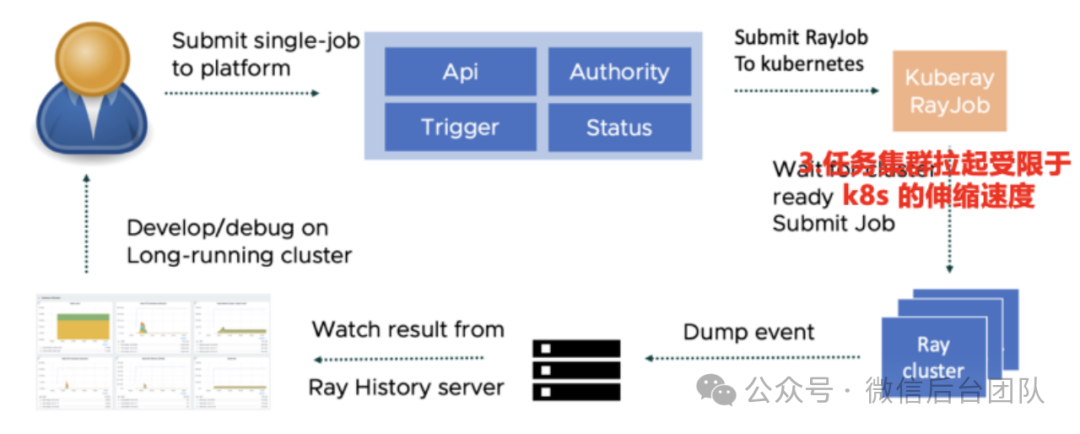 总的来说,Ray提供了高性能的分布式框架和简单的分布式原语,提供了统一的分布式底盘。Ray融合不同计算范式,与众多开源组件便捷地结合从而实现对现有流程的提效。同时,Ray有完善的生态,数据处理、训练、推理和服务等AI基础设施需要的主流框架都可以很方便地在Ray上进行集成,大量知名企业选用 Ray开发 AI 计算。综上,我们选择了Ray 作为微信 AI 计算平台的分布式底座。3. Ray在微信AI计算中的大规模实践