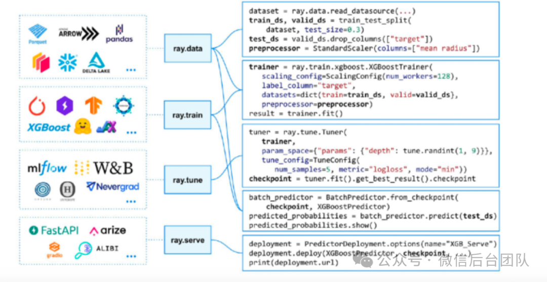 图 4:Ray AIR 如何以简单的方式统一 ML 库[2]其次,大多数流行的 ML 库都与 Ray 有很强的集成性,而且 Ray 的原生库也整合了这些库。例如,开发者可以轻松地将 XGBBoost 与 Ray Train 结合使用,可以轻松地将 HuggingFace 与 Ray Serve 结合使用。或者,可以轻松地将 PyTorch 和 TensorFlow 与 Ray Train 结合使用。简而言之,它拥有丰富的集成生态系统,不仅与 ML 库集成,还与其他工具和框架集成。第三,开发人员可以使用笔记本电脑进行开发。当你想将其扩展到 Ray 集群时,只需更改一行代码或不更改任何代码即可轻松完成。RAY_ADDRESS=ray://<cluster>:<port> python your_script.py