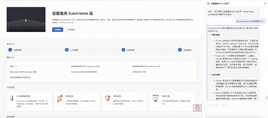 对于使用控制台创建集群的用户,AI 助手会在其进入创建确认页时自动被唤起,并基于 ACK 专家的相关经验快速对即将被创建的集群的配置进行快速分析,从稳定性、安全性、性能和网络等多个维度提供优化建议:除此之外,我们在创建集群页提供了划词咨询功能,用户可以通过此途径便捷地唤起 AI 助手对选中字段进行解释,从而扫除知识盲点造成的障碍:非控制台用户同样能受益于 AI 助手,它可以辅助生成包括 Terraform 等在内的基础设施即代码(IaC),大大简化集群资源配置的编排过程:AI 助手专家般的辅助支持使得集群部署的效率显著提升,用户不必再过度聚焦繁琐的配置细节,而是可以更关注自身业务的发展。Day 1 - 部署与初始化配置