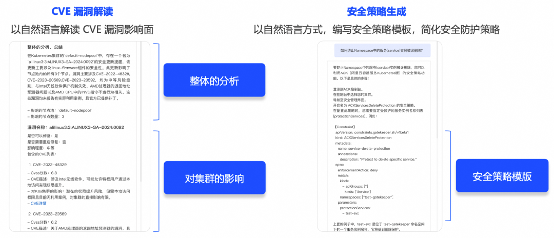 针对安全性这一领域,AI 助手 2.0 提供了智能安全分析能力,旨在基于容器服务的安全能力,并结合专家知识、容器领域大模型,将集群安全风险快速透出。智能安全分析包含以下几个方面:容器镜像安全扫描、安全策略辅助配置、集群节点 CVE 检查、工作负载配置风险扫描、集群运行时风险监控。下图展示了 CVE 漏洞解读与安全策略生成相关功能: