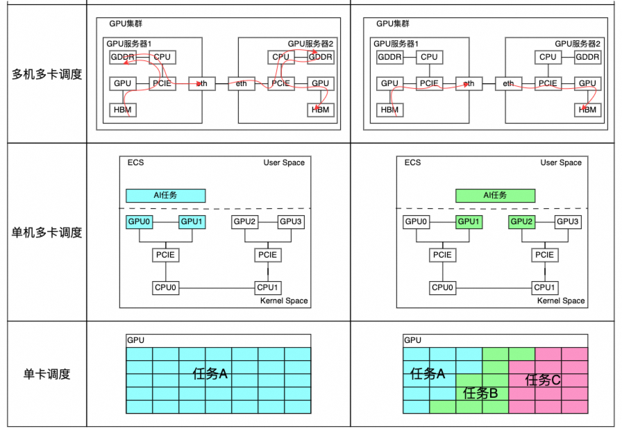 如上图所示, AI任务对于GPU资源的利用方式,以任务视角切入GPU资源的调度,从宏观到微观可以划分为: