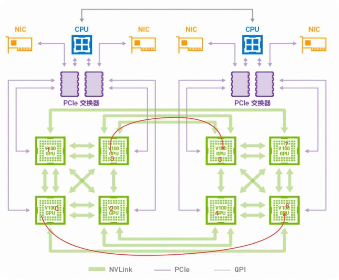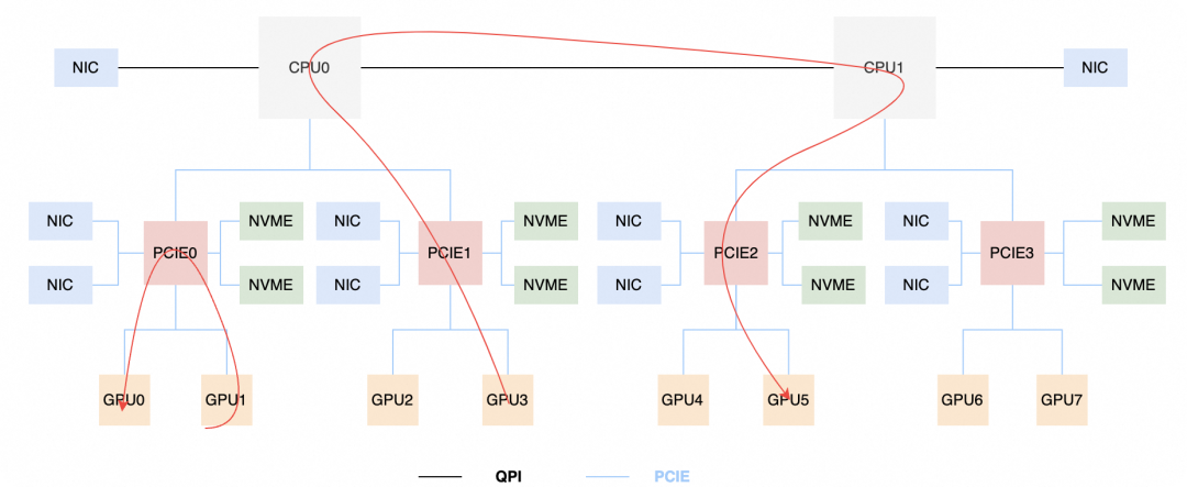 PCIE设备在单机内可以实现多个设备的数据传输,比如上图就是一个典型的8卡机器内的,GPU通过PCIE实现设备之间的互联,但是NIC、NVME、GPU是共享一个PCIE的总带宽的。如果涉及跨CPU的GPU之间通信,则会被CPU之间的链路限制。比如图示的GPU0-GPU1会收到PCIE0的影响,GPU3-GPU5会经过两个CPU之间的交互。所以资源调度使用的GPU间拓扑架构对任务整体表现是具有很大影响的。