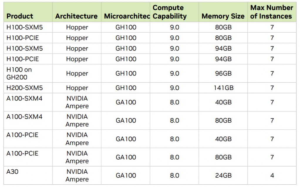 从NVIDIA安培一代开始的gpu(即具有计算能力>= 8.0的gpu)支持MIG。下表提供了支持的gpu列表: