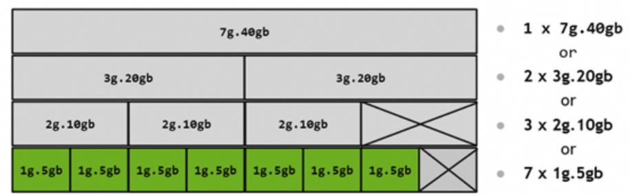 GPU在MIG中分为GI和CI单元,其中CI单元是GI单元的subset,共享GI单元的共享内存和带框。而GI之间的算力在物理层面是隔离的。而GI是 GPU 切片和 GPU 引擎(DMA、NVDEC 等)的组合。GI内的任何内容总是共享所有内存和其GPU,但其SM切片可以进一步细分为CI。GI提供内存级别的QoS,每个GPU slice包含专用的GPU内存资源,这些资源限制了可用容量和带宽,并提供内存QoS。每个GPU内存切片获得总物理层面GPU 内存资源的 1/8,每个 GPU SM 切片获得总物理层面SM数量的1/7。CI包含父GI的SM切片和其它GPU引擎(DMA、NVDEC 等)的子集,其共享内存和引擎。比如下图是A100卡可以划分的MIG类型。