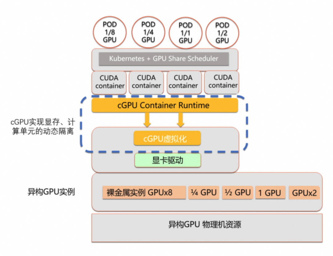GPU容器共享技术cGPU是阿里云基于内核虚拟GPU隔离的容器共享技术。即多个容器共享一张GPU卡,从而实现业务的安全隔离,提高GPU硬件资源的利用率并降低使用成本,可以实现显存或算力两个维度的隔离和组合。