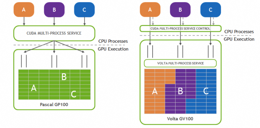 多进程服务(MPS)是对 CUDA 应用编程接口(API)的一种替代性实现,并且与原有的二进制代码兼容。MPS 的运行时架构旨在透明地支持协作式的多进程 CUDA 应用,主要是消息传递接口(MPI)任务。MPS时Nvidia在Pascal架构引入的,并在Volta架构中进一步的完善。Volat-MPS相比较之前的MPS,主要在以下几个方面做了提升: