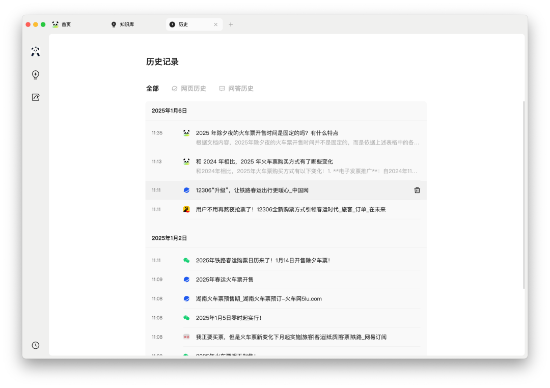 即使一时忘记将某些关键信息保存到知识库中也没关系,ima 客户端提供的「历史记录」功能会自动记录每一次搜索操作。这样,我们可以随时查找遗漏的信息或早前的草稿版本,无需重复机械化的搜索过程。例如,当需要查找某条遗漏的 12306 的变化信息时,可以通过历史记录快速定位,大幅提升素材收集和整理的效率。