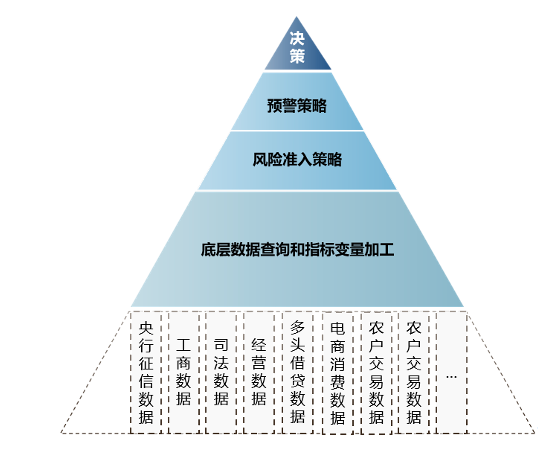 风控底层数据需要包括个人数据、小微企业/商户/农户等资产数据、交易数据、经营数据、信用数据等维度。访问底层数据并根据不同业务场景加工指标变量,如生猪出栏量、养殖场数量、饲料采购量、企业对外投资数量,法人对外任职最长时间、企业对外投资被吊销企业数量等。根据不同业务场景、细分各个场景下的客群、根据业务场景和客群定制准入规则、反欺诈规则/模型、风险准入策略、保后风险预警策略等。大数据风控平台通过金融科技手段为四川农担实现公司风险控制从“人控”到“机控+智控”的转变,降低由于信息不对称、分析能力不足而带来的业务风险,真实完整及时地展现四川农担风险情况,提升公司风险控制能力和审查审批效率。