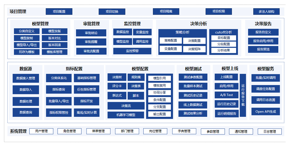 中电金信大数据风控平台满足数据源管理模块支持三方数据、内部业务数据的接入及有效管理。数据源需支持信创数据库和接口形式数据的接入。提供友好的可视化操作页面,支持数据源数据字典自动获取及业务标注。支持实时调用与离线调用多种调用方式。中电金信大数据风控平台满足变量管理支持变量体系的建设,可以多层级的变量分类管理。支持自动读取数据源的数据字典,并可拓展支持变量类型、角色等的定义,支持业务化解读。内置多种变量加工函数,支持衍生变量定义及复杂业务逻辑开发。支持衍生变量的试算测试,验证变量加工逻辑的正确性。中电金信大数据风控平台满足策略中心支持策略管理、策略配置、策略发布、策略运行、策略应用以及策略运营。策略管理:用于对策略管理要素的录入编辑和展示等,对策略库的分级分类管理,基于特定的业务场景,制定相应的策略模板。策略配置:支持对规则集、评分卡、决策表、决策树、决策流、表达式及机器学习等组件配置,以可视化的方式进行顺序、分支、并行等多种方式的执行流程编排,提供友好的操作界面,支持提供不同组件的组合配置,满足不同领域的策略组合的有效封装,支持策略在不同环境的导入和导出。策略发布:支持从策略配置完成到真正投入生产应用的过程中的相关验证和管理,主要包括对策略进行试算并评估其效果,记录策略版本,对版本差异进行对比和策略版本回滚等,对当前的策略自动形成相关报告,对策略的发布过程进行审核,并最终实现策略的快速发布。策略运行:支持策略的实时运行和离线批量运行,保证策略在运行期间不中断服务,实现即时更新,支持策略的AB实验,根据策略运行情况,对策略的执行过程进行跟踪和透视,定位执行路径,支持使用历史数据对新版本策略效果进行回溯。多种方式完成策略效果的评估,包括通过率、命中率等评估,并提供统一的策略监控展示页面。策略应用:支持策略上线后提供统一的对外服务渠道,包括应用的密钥分配、授权认证、调用白名单设置、接入接口文档的查看及下载。策略运营:包括策略监控、策略优化和运营大盘三部分。策略监控主要包括策略稳定性、变量稳定性、策略效果的监控。策略优化包括策略的变量分析、策略阈值优化。运营大盘支持对风控进件、审批、授信、保后等关键指标进行实时监控分析。策略监控报表和运营大盘支持图表组件的自定义配置,支持多维交叉分析。中电金信大数据风控平台完全满足需求,系统管理支持用户、角色、机构管理、数据权限管理、应用菜单管理、审批管理、参数管理、日志管理等。