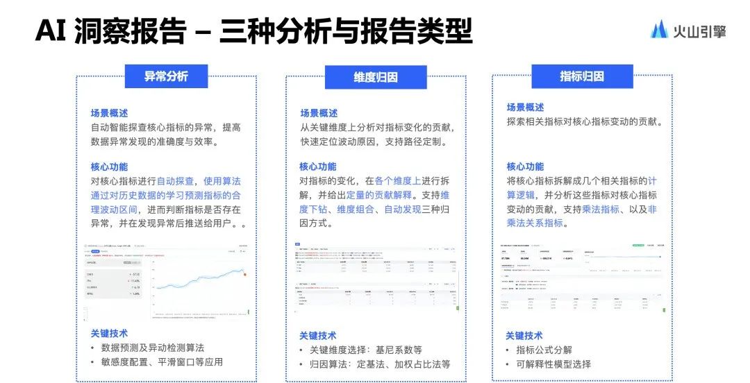 AI洞察报告:例行数据探查、异常识别、报告生成、报告推送归因报告中能够支持三种报告类型,分别为异动分析、维度归因以及指标归因。