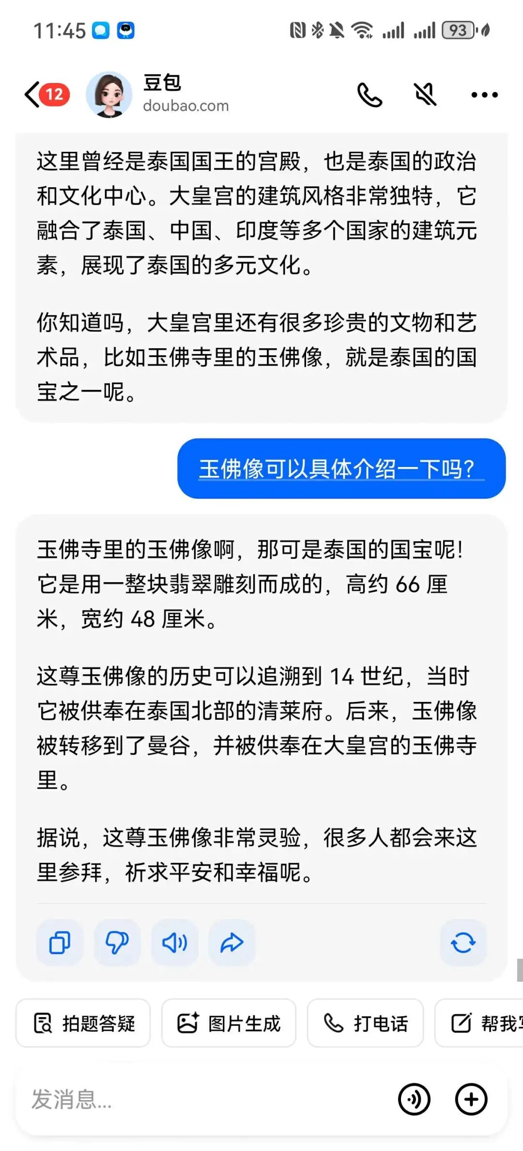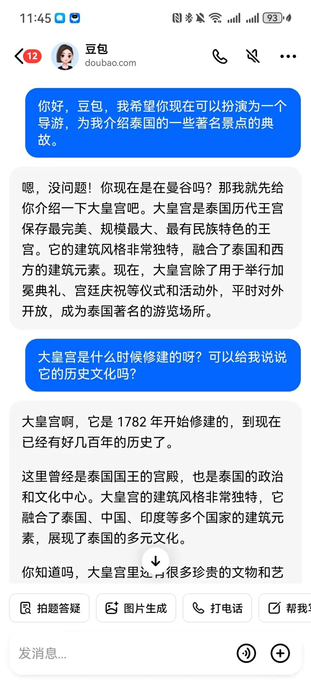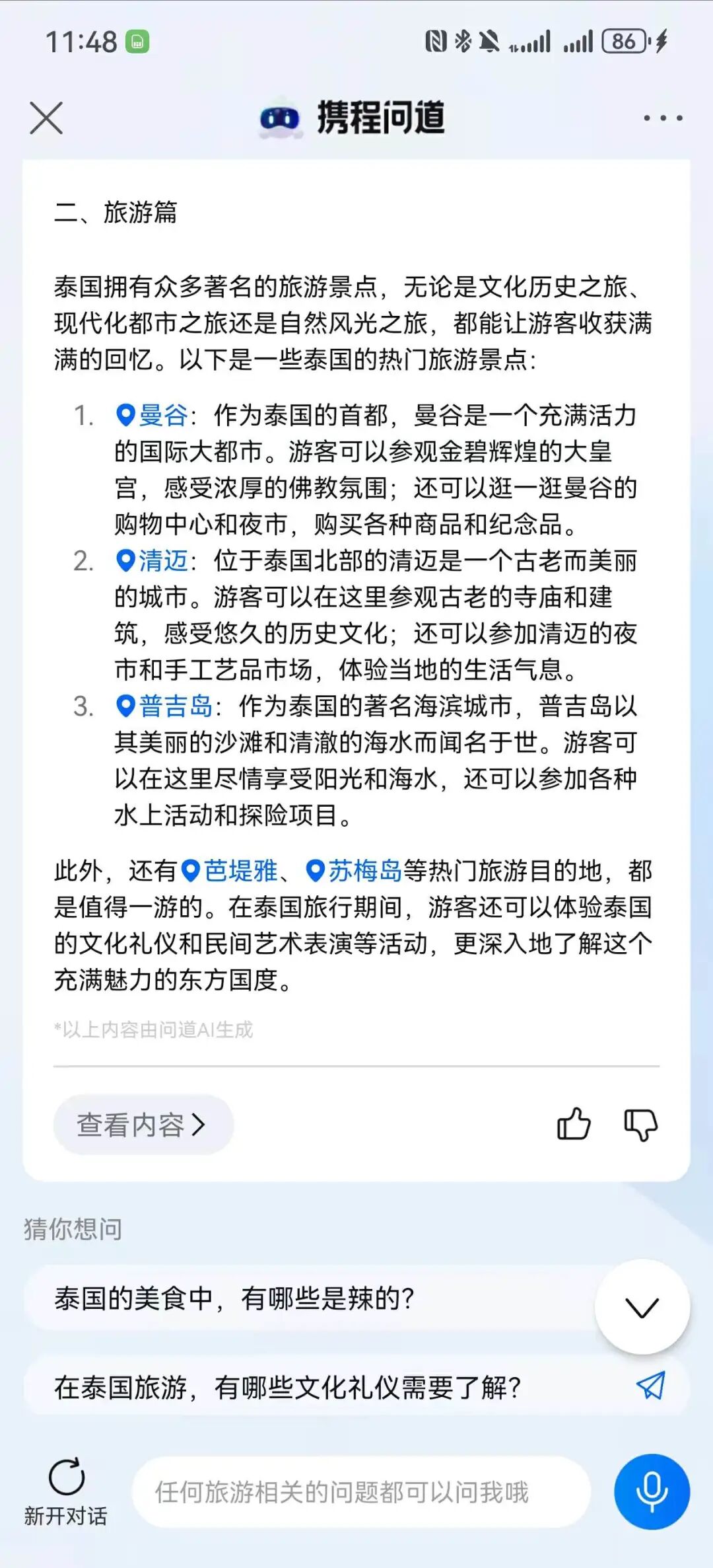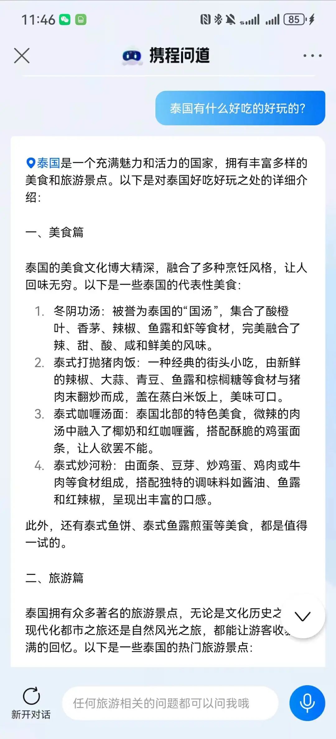 带着GPT 4o去博物馆游玩的小汪说:“本来以为又要走马观花式的旅游了,想到可以试下GPT 4o的拍照识图功能,没想到效果奇好,以前逛2小时结束的展馆,实际逛了将近6小时。”“有的展品文字不多,GPT 还能根据图中的一些信息补充相关历史知识,有不懂的还能继续追问,比如这个事发生的时候背景,德川家康为什么一开始愿意听丰成秀吉的话等等。”当然,现阶段AI chat也不是那么聪明,比如智谱AI分不清天台山和天台庵的区别。在用户已经说了是访古游的前提下,腾讯元宝仍然大量推荐自然景观。豆包把第一天推荐的地方,第二天又推荐了一遍。通义千问则推荐了一个不在旅游城市的地名出来。AI在信息获取的实效性也不行,产品经理小刘解释道:“因为在AI的知识库里存储的内容很可能已经过时了,所以极大可能会导致生成的文本信息不够准确。” 试想如果游客在查询某个景点的开放时间时,AI提供的信息却已经过期,很可能导致游客白跑了一趟。除了把AI当成导游,全能的AI还能解决实时翻译、情感陪伴、拍照修图的难题。以往,阻断很多人选择出国旅游的最大原因就是语音不通,如今有了AI面对面翻译,这个问题再也不是难题了。据悉,荣耀、华为、小米在近日都推出了AI面对面翻译功能。晓然今年国庆选择了去泰国,在和外国人沟通时,她只需对着华为手机说:“小艺,小艺,面对面翻译。”立马就能调出华为的AI翻译功能,并且支持同声传译。