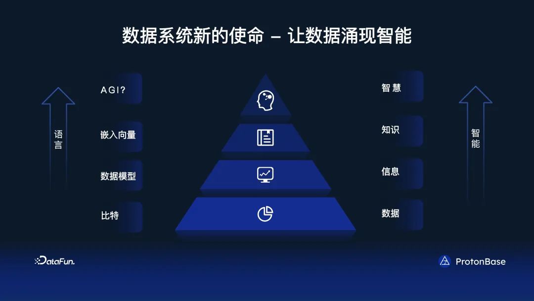 可以看到过去这些年数据系统的发展,已经从信息层逐渐转移到知识层。数据系统的使命也在悄然发生变化。它不再满足于存储、提取、管理、以及汇总分析信息。表达、理解和使用知识将会成为数据系统的一个重要部分。我们断言数据系统新的使命将会是:让数据涌现智能!