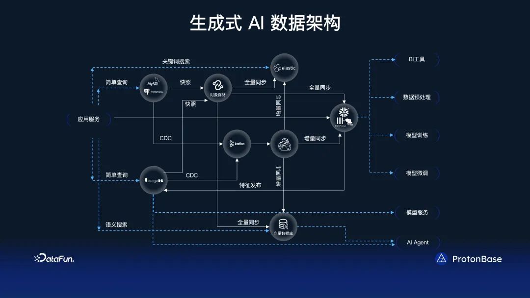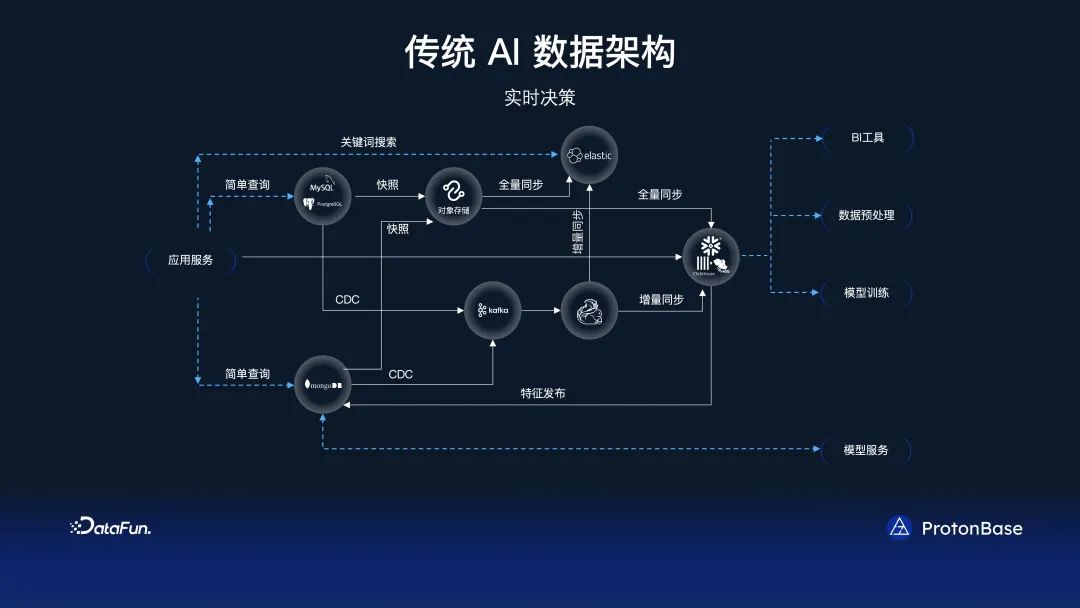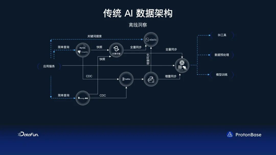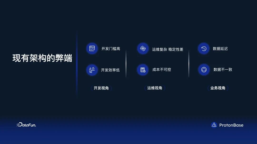 • 开发视角:构建这样复杂的架构有较高的开发门槛。开发人员需要学习和理解多个不同的数据产品,每个数据产品都有一些局限性,开发人员还需要去理解和绕开这些问题。对很多中小公司来说,招到这么多优秀的数据和 AI 工程师是个挑战,从而导致很多数据的业务价值并没有完全地挖掘出来。即使团队很幸运拥有这些工程师,他们也需要把大量的时间花在繁琐的数据同步上,这无疑极大地降低了开发效率,降低了业务的迭代速度,阻碍了业务的发展。