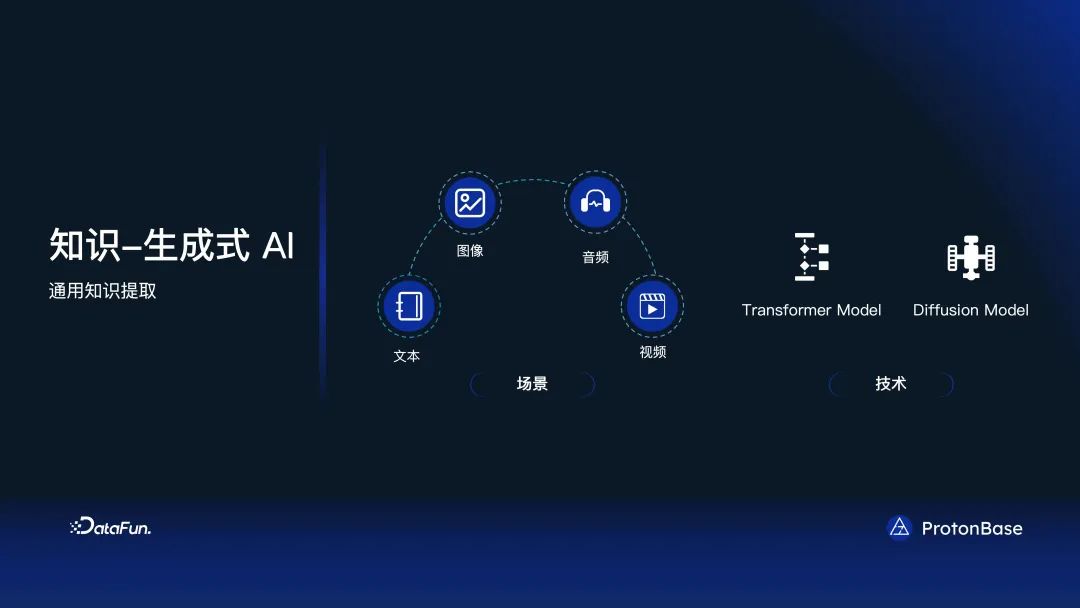 接下来介绍在生成式 AI 时代如何提取和应用知识。过去几年我们见证了生成式 AI 的崛起,特别是基于 Transformer 架构的大语言模型在理解和生成文字,以及基于 Diffusion 的图像模型生成图像上取得了重大的突破。生成式 AI 能生成高质量的文本甚至代码,能够通过文生图、图生图的方式生成图像,能够通过文字生成音频甚至视频,这一系列能力极大地拓宽了 AI 的使用场景,也在重新定义什么是非结构化数据,它以一种全新的方式给传统的非结构化数据赋予结构,从中提取知识。